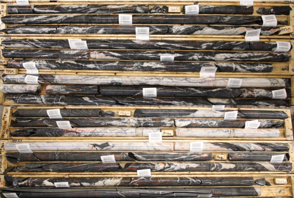 A geologist examines the drill core and marks out the intervals to be sampled and the cutting line. Sample lengths are mostly 1.0 meter and adjusted to respect lithological and/or mineralogical contacts and isolate narrow (<1.0m) veins or other structures that may yield higher grades.