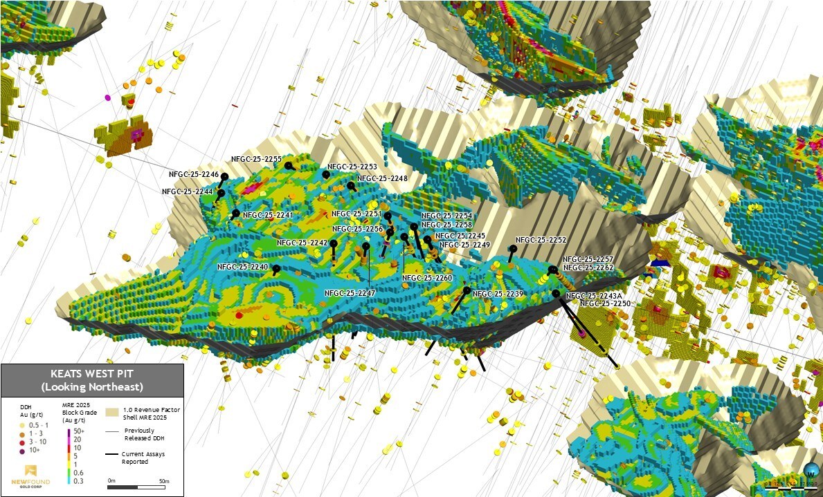 Melissa Render, President of New Found Gold stated: “Today’s results confirm the continuity and high-grade tenor of gold mineralization at Keats West, as well as the in-pit and near-pit expansion potential. These domains of high-grade mineralization start at surface and remain above a vertical depth of 150 metres and are located in proximity to other key zones, such as Iceberg and Keats in the AFZ Core area. Project advancement following the release of the initial MRE in March 2025 is focused on derisking high priority open pits, like Keats West with infill drilling targeting the higher-grade portions to start.”