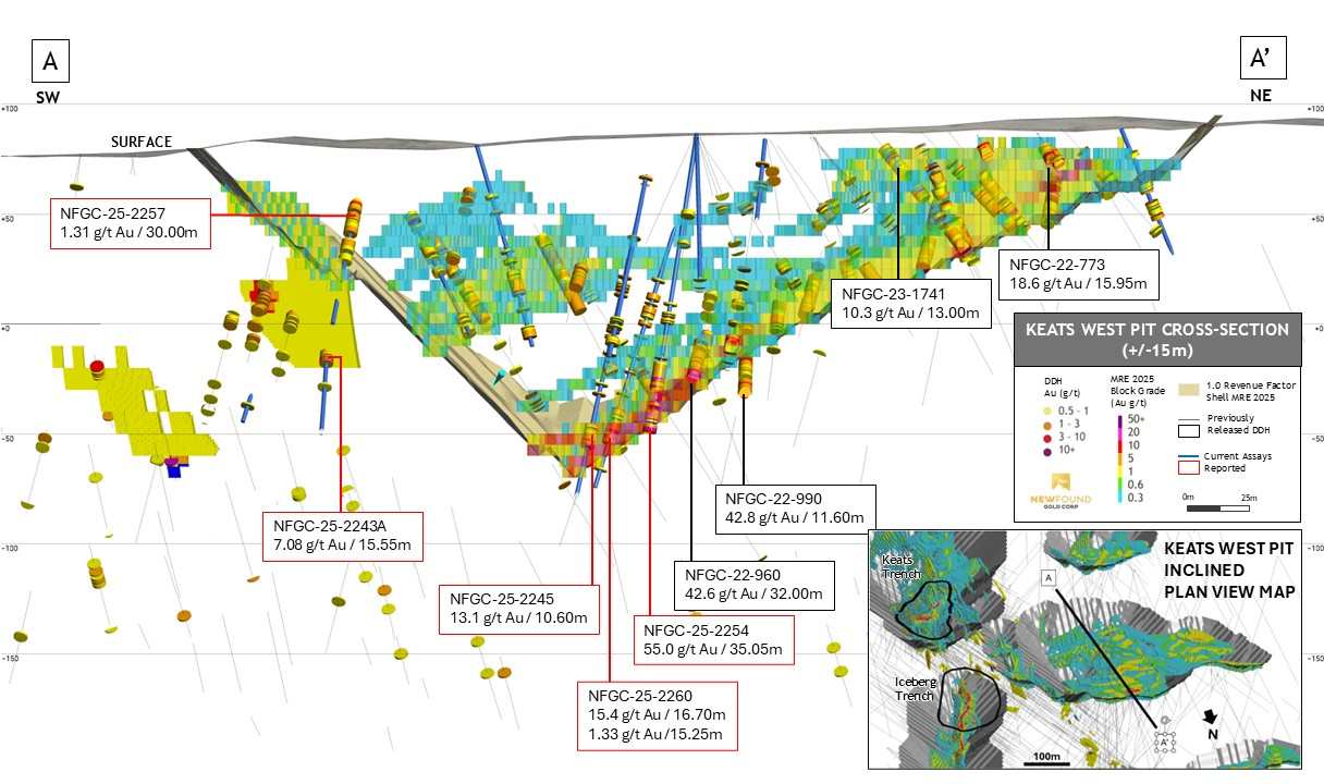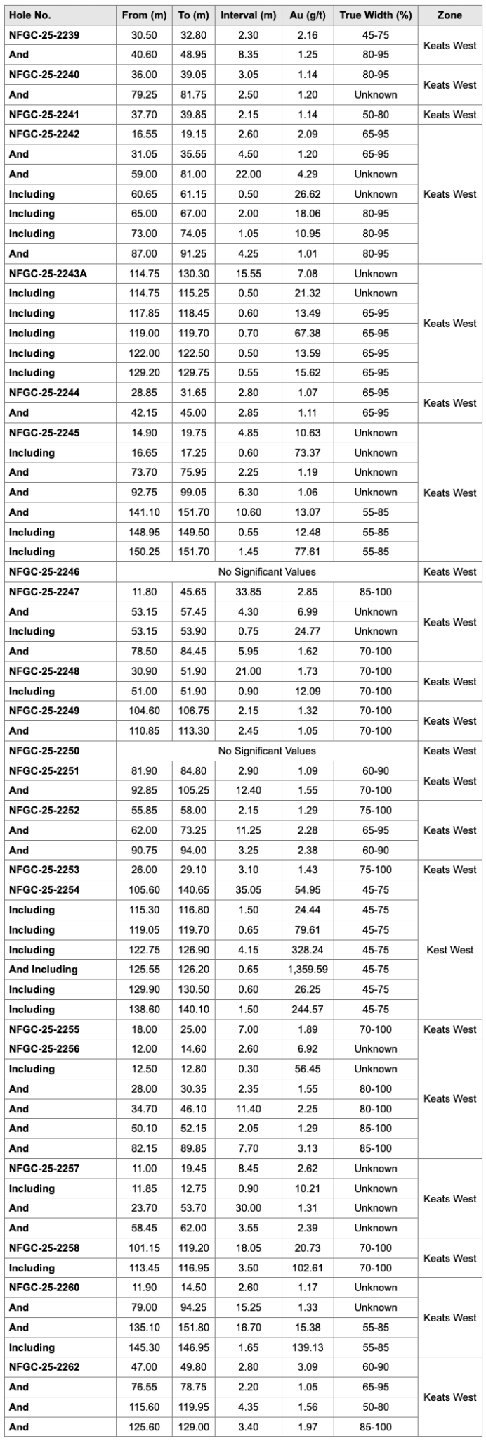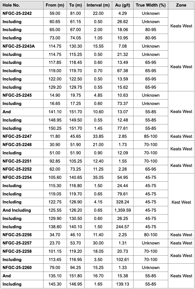 - Keats West highlight infill holes targeting the high-grade domains announced today include 55.0 g/t Au over 35.05 m (NFGC-25-2254), 20.7 g/t Au over 18.05 m (NFGC-25-2258), 15.4 g/t Au over 16.70 m (NFGC-25-2260) and 13.1 g/t Au over 10.60 m (NFGC-25-2245). These intercepts demonstrate the strong continuity of the high-grade corridors within the hosting Keats West fault zone that has a mineralized footprint of 315 m wide by 305 m long, with true widths averaging 20 m and ranging up to 50 m (Figure 1).