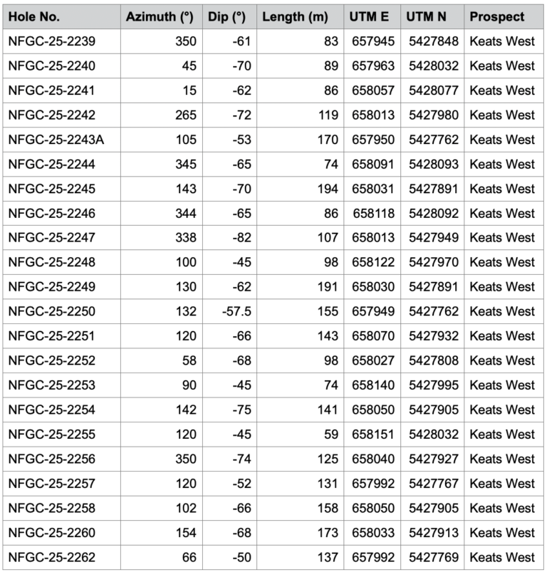 - 7.08 g/t Au over 15.55 m (NFGC-25-2243A) was intersected at the south end of the Keats West zone, immediately beyond the proposed open pit, within the extents of one 50 m long preliminary UG panel that contributed to the MRE in the Keats West area (Figures 1 and 2). Follow up drilling has been completed in this sparsely tested region; results of this program are pending.