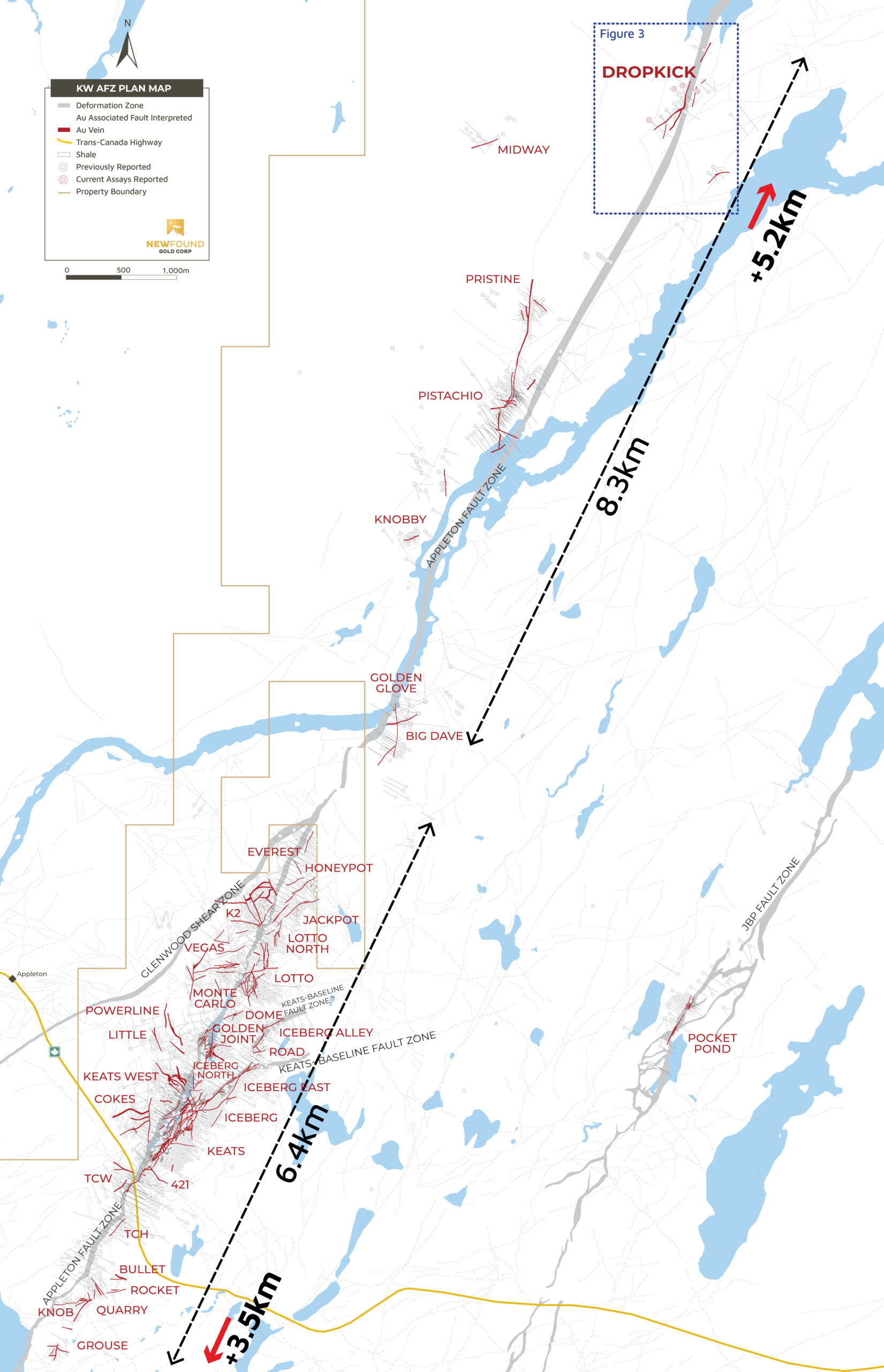 Keith Boyle, CEO of New Found, stated: “This initial first-pass program at Dropkick is off to an excellent start and our team is thrilled by this early success. Until now, these grades and widths have only been observed in the primary discovery area, around the Keats Zone, over 11km to the southeast. Results like these are a testament to the strength of the gold mineral system associated with the AFZ, and this exploration discovery at Dropkick exemplifies one of the reasons that drew me to New Found: the ongoing discovery potential and district-scale growth opportunity.