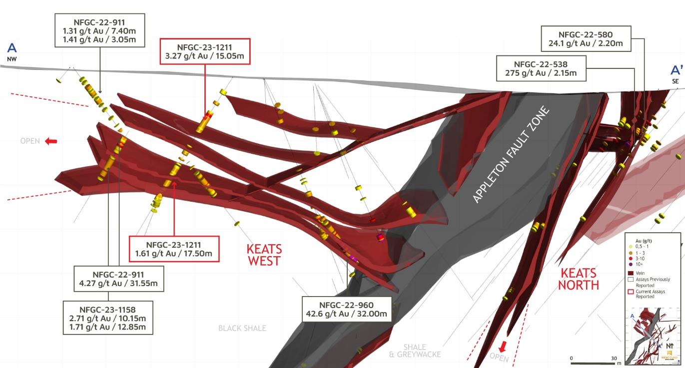 - Additional intervals released today such as 3.39 g/t Au over 13.95m in NFGC-23-1200, 1.36 g/t Au over 18.95m in NFGC-23-1209A, and 1.41 g/t Au over 17.75m in NFGC-22-894 are characteristic of the broad domains of gold found at Keats West, with true widths of these intercepts estimated to be between 70-95%.